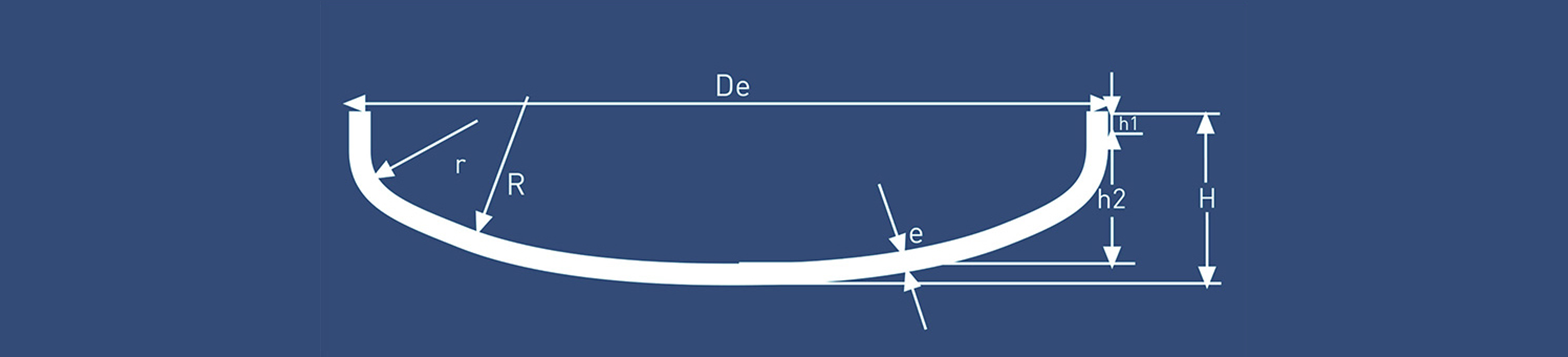 De:外徑e:投料厚度R:封頭半徑r:轉(zhuǎn)角半徑H:總高度h1:直邊高度h2:外曲面高度